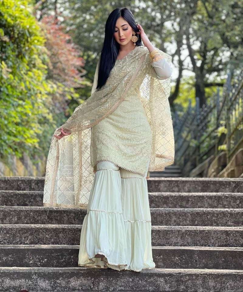 đPlazzo Fabricc*:Faux Georgette With Heavy Embroidery 5 mm Sequence Wor